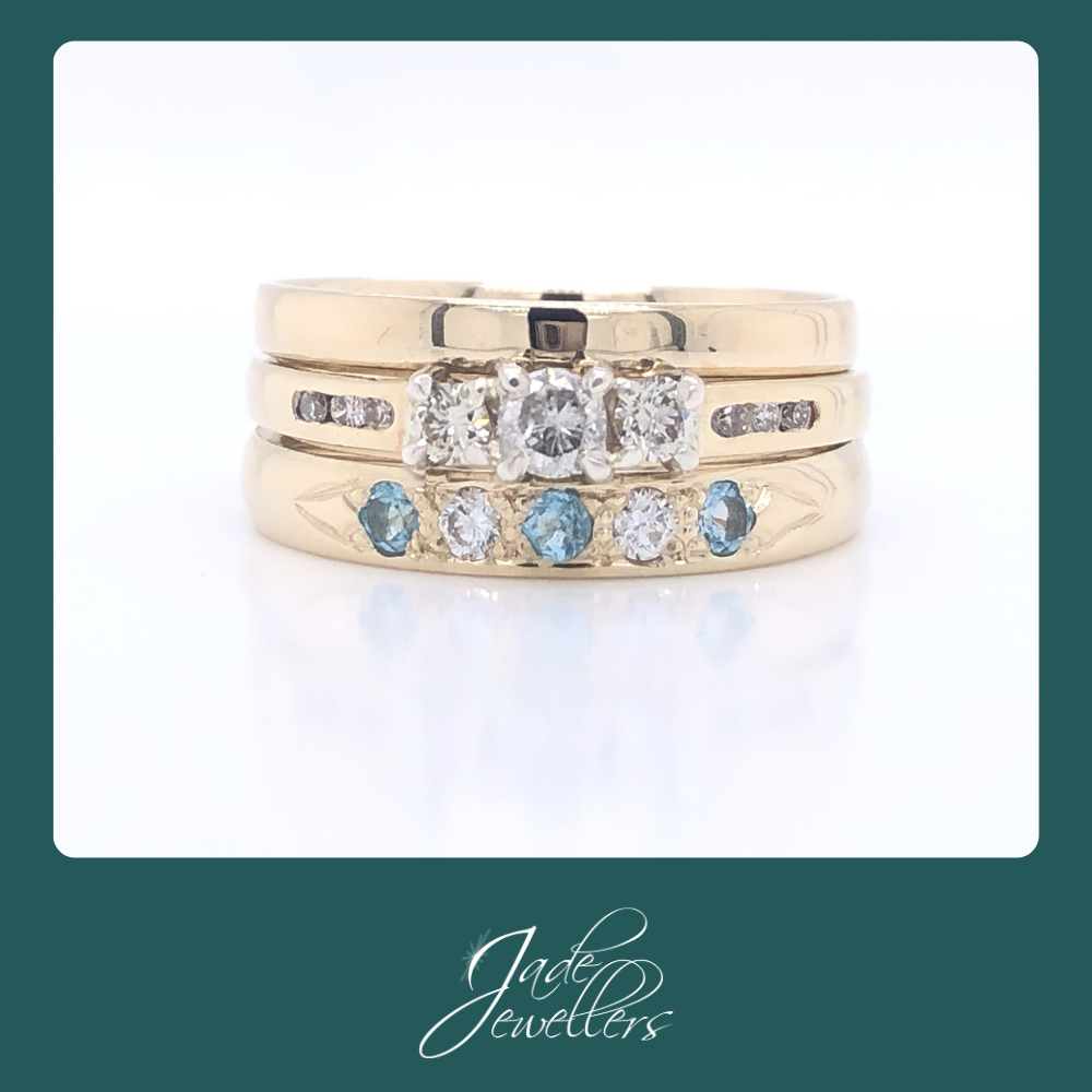 Restored 9ct Yellow Gold Blue Topaz & Diamond Wedding Set