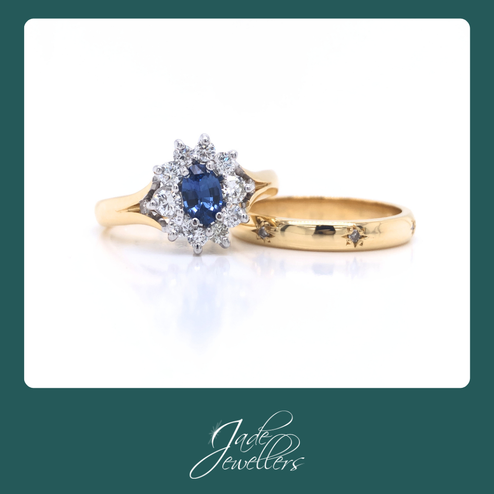 Restored 18ct Yellow Gold Sapphire & Diamond Halo Engagement & Wedding Ring