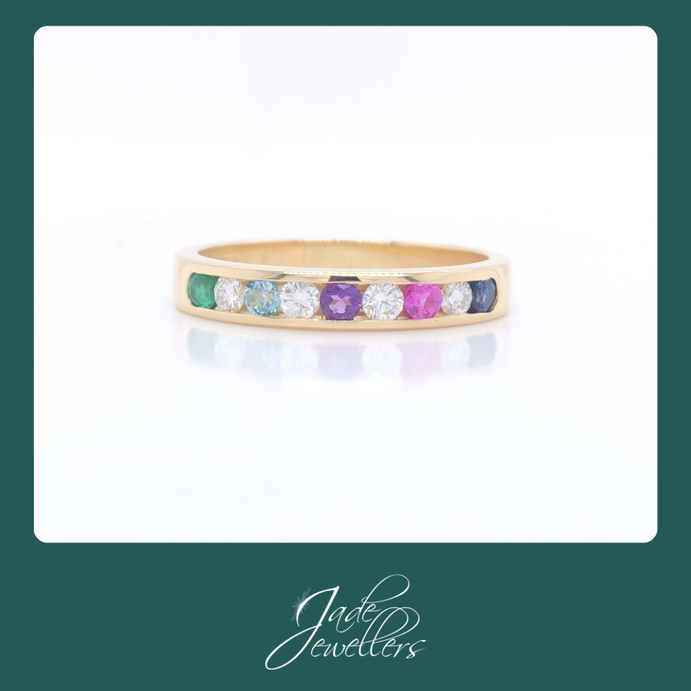 Custom Made Hand Crafted 18ct Yellow Gold Channel Set Emerald, Aquamarine, Amethyst, Pink Tourmaline, Sapphire & Diamond Ring