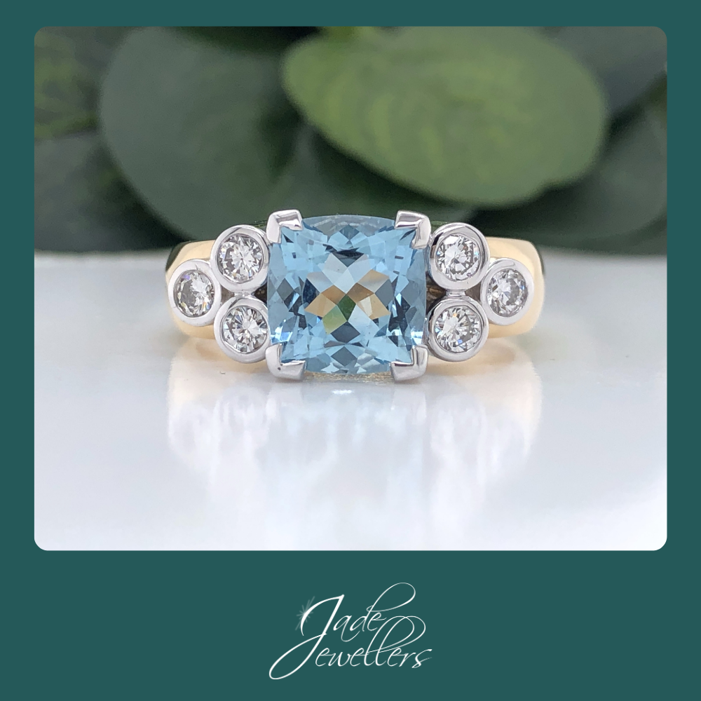 Custom Made Hand Crafted 9ct Yellow & White Gold Aquamarine & Diamond Ring